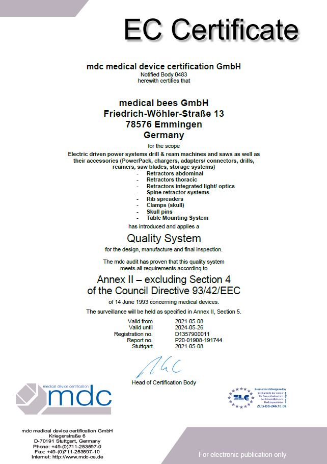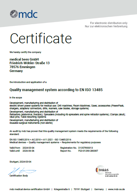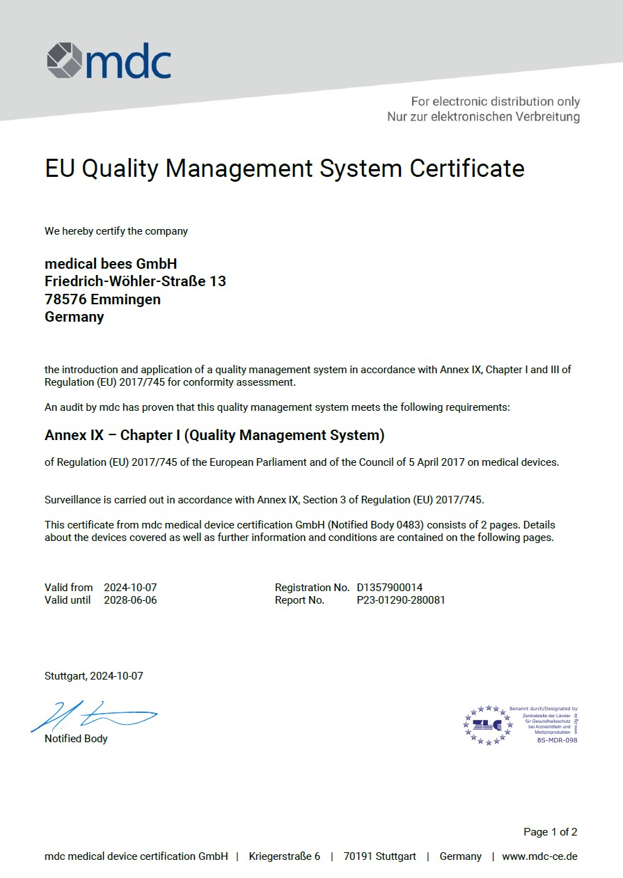 The mdc medical device certification GmbH certifies that medical bees GmbH has implemented and applies a quality management system. We provide this certificate to our customers in this area, and you can quickly and easily download it.