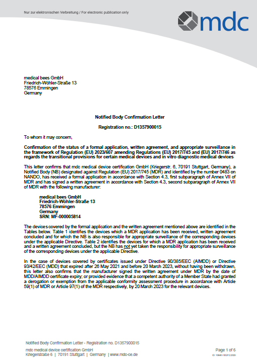Medical bees is currently in the certification phase for the MDR certification.